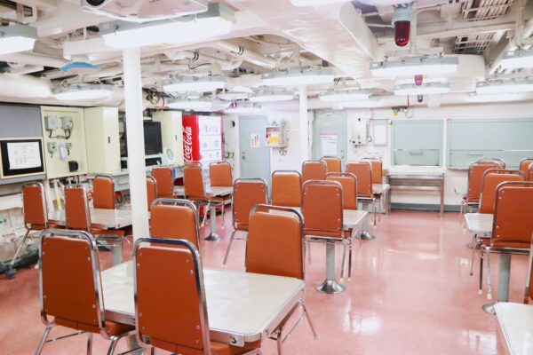 操縦室は艦を操縦する場所で、艦の航行を制御する様々な装置や機器が設置されています。具体的には、操舵装置、速度計、航路地図、レーダー、無線機などが設置されていて、艦長の指示に従って操縦士がこれらの機器を操作し、艦を安全かつ効率的に操縦します。自衛隊スタッフによる説明の最後には、艦が緊急事態に直面した際に艦内で流される「サイレン」の音を特別に聞かせていただきました。さすがに海の上でこんなけたたましいサイレンを聞いてしまったら、パニックになってしまいそです。これには自衛隊員みなさんが、本当に危険と隣り合わせの日常を過ごしている事を少しだけ垣間見る事ができました。