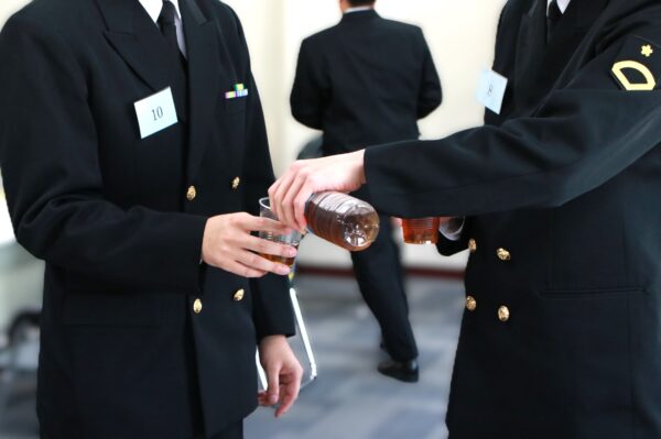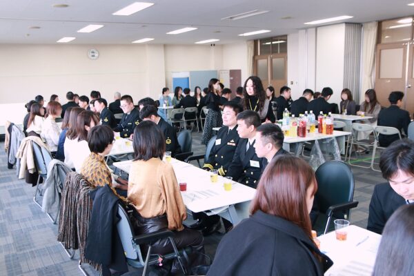 みなさんのメッセージカードを回収して、誰と誰がマッチングしているかを集計します。その間は歓談タイムとさせていただきます。みなさん緊張でのどが渇いたのか、一斉にドリンクコーナーに集まります。お互いやり切った感でいっぱいの自衛隊員の満面の笑顔がとても印象的でした。