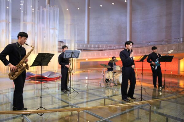 ほとんどの参加者が受付をすませた頃、エントランスホール『うずしお』では、防大の音楽系サークルよるミニコンサートを開催。最初に演奏したのは、ジャズ研究同好会。厳しい訓練と勉強を両立させる中、日々練習を重ね今日のお披露目となりました。
